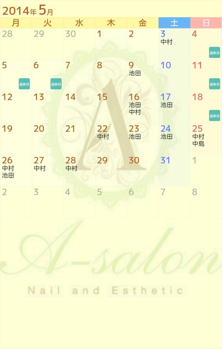 MENU トップページ インフォメーション エステ(フェイシャル&ボディ) ブライダル 高速脱毛&まつ毛カール お問い合わせ アクセス yoga&exercise Facebook Instagram BLOG INFORMATIONお知らせ 2014/04/06(日) 17:54 5月のお休み お休みアップいたしました! ご予約お待ちしております
