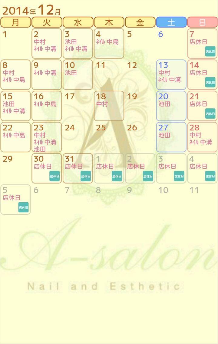 MENU トップページ インフォメーション エステ(フェイシャル&ボディ) ブライダル 高速脱毛&まつ毛カール お問い合わせ アクセス yoga&exercise Facebook Instagram BLOG INFORMATIONお知らせ 2014/11/04(火) 23:16 12月のお休み ネイル 中島 中溝 アーユルヴェーダ 中村 エステ 池田 年末は29まで営業しております!たくさんのご予約お待ちしておりまーす\(^-^)/