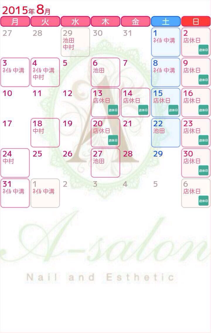 MENU トップページ インフォメーション エステ(フェイシャル&ボディ) ブライダル 高速脱毛&まつ毛カール お問い合わせ アクセス yoga&exercise Facebook Instagram BLOG INFORMATIONお知らせ 2015/07/05(日) 16:46 8月のお休み 8月は13〜16日がお盆やすみとなります。 名前がある日がそのスタッフのお休みの日となります。 エステ 店長池田 ネイル中溝 アイ、アーユルヴェーダ 中村