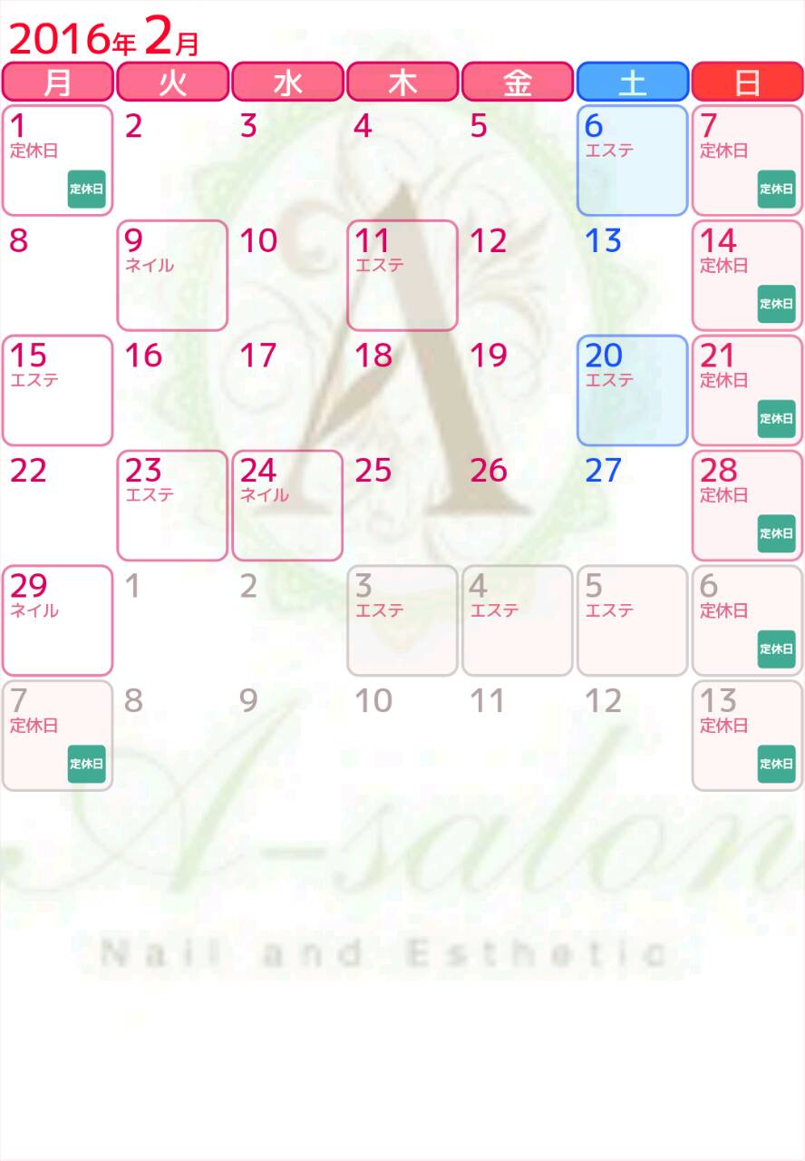 MENU トップページ インフォメーション エステ(フェイシャル&ボディ) ブライダル 高速脱毛&まつ毛カール お問い合わせ アクセス yoga&exercise Facebook Instagram BLOG INFORMATIONお知らせ 2016/01/08(金) 02:27 2月のお休み あけましておめでとうございます☆ 2016年もどうぞよろしくお願い致します 2月のお休みをお知らせ致します 今年はサロン内、模様替えをしてみました 新しくなったサロン、是非いらしてくださいね スタッフ一同心よりお待ちしております ヽ(*´▽)ノ♪