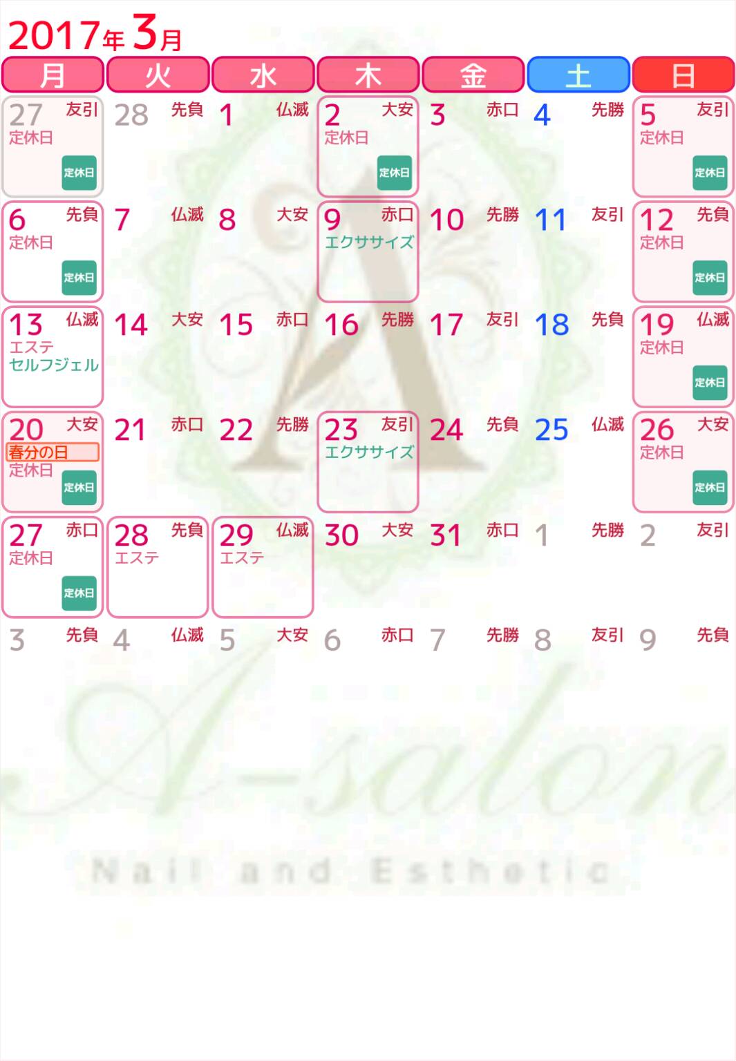 MENU トップページ インフォメーション エステ(フェイシャル&ボディ) ブライダル 高速脱毛&まつ毛カール お問い合わせ アクセス yoga&exercise Facebook Instagram BLOG INFORMATIONお知らせ 2017/02/04(土) 15:59 3月のお休み&講座スケジュール 2月はバレンタイン☆ サロンも心ばかりのプチギフトご準備しております(*´∀`) 3月のおやすみ&講座の日程ご覧下さい。 ご予約お待ちしております!